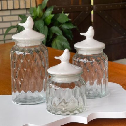 Em até 2x de R$ 69,95 sem juros À vistaR$ 132,91no PixKIT 3 POTES DE VIDRO C/ TAMPA PASSARINHO EM CERAMICA -REF: 251661