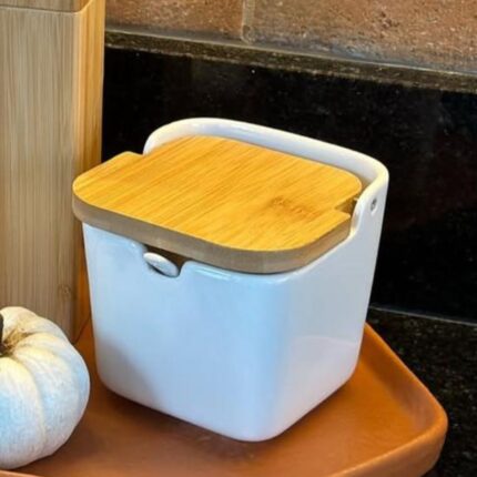 Em até 2x de R$ 69,95 sem juros À vistaR$ 132,91no PixSALEIRO DE MESA DE CERAMICA C/TAMPA DE BAMBU E COLHER BIANCO 10cm x 10,5cm x 10cm