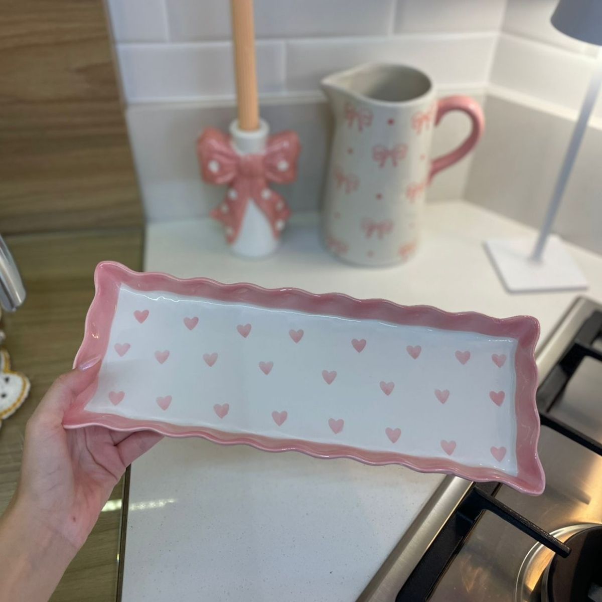 Um verdadeiro charme para compor momentos especiais! Essa travessa une delicadeza e romantismo em cada detalhe, com bordas onduladas, acabamento em tom rosado e estampa suave de corações que encantam à primeira vista.