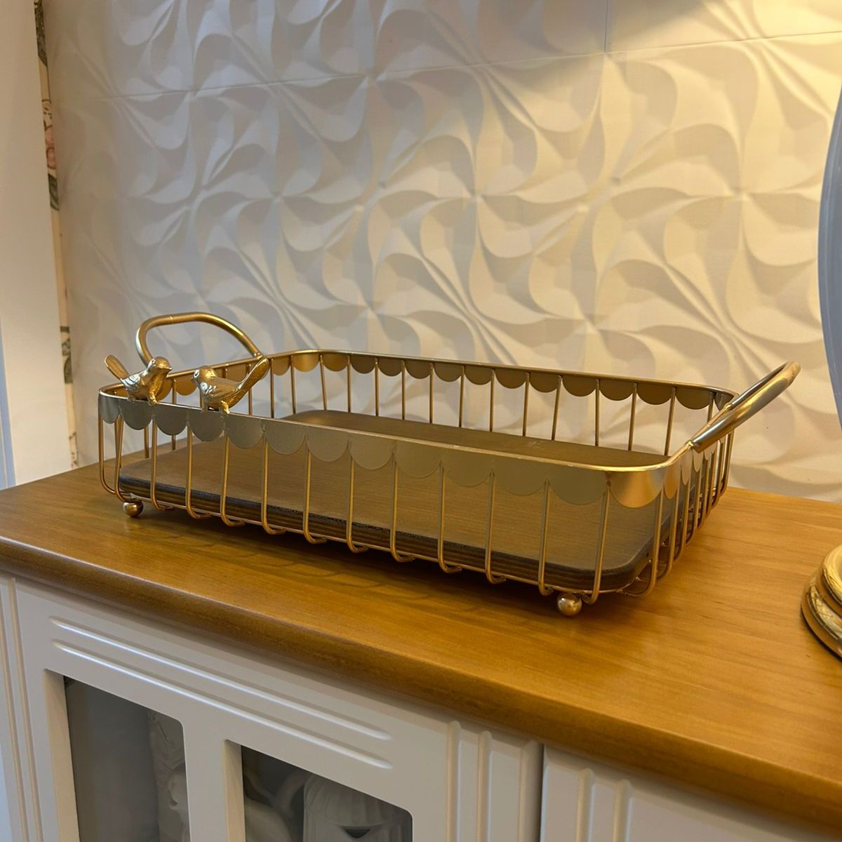 BANDEJA RETANGULAR COM PASSAROS DOURADA M 46X23X11CM