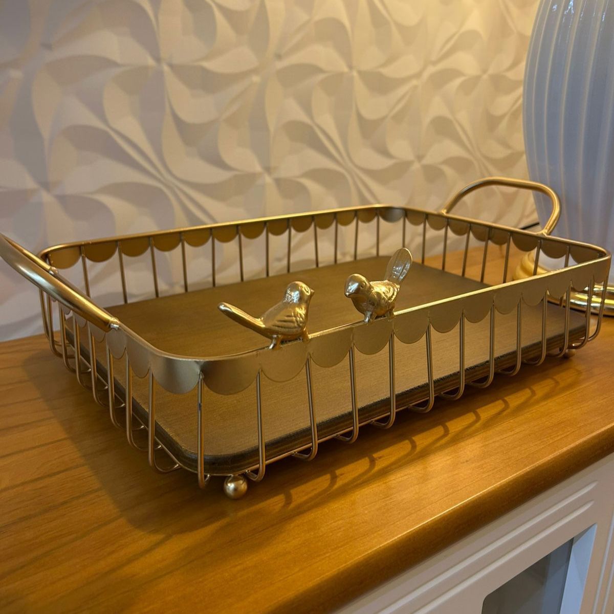 Delicada, elegante e cheia de charme, essa bandeja em metal dourado é o toque especial que transforma qualquer ambiente. Com detalhes encantadores de pássaros e acabamento sofisticado, ela une funcionalidade e beleza em uma única peça.