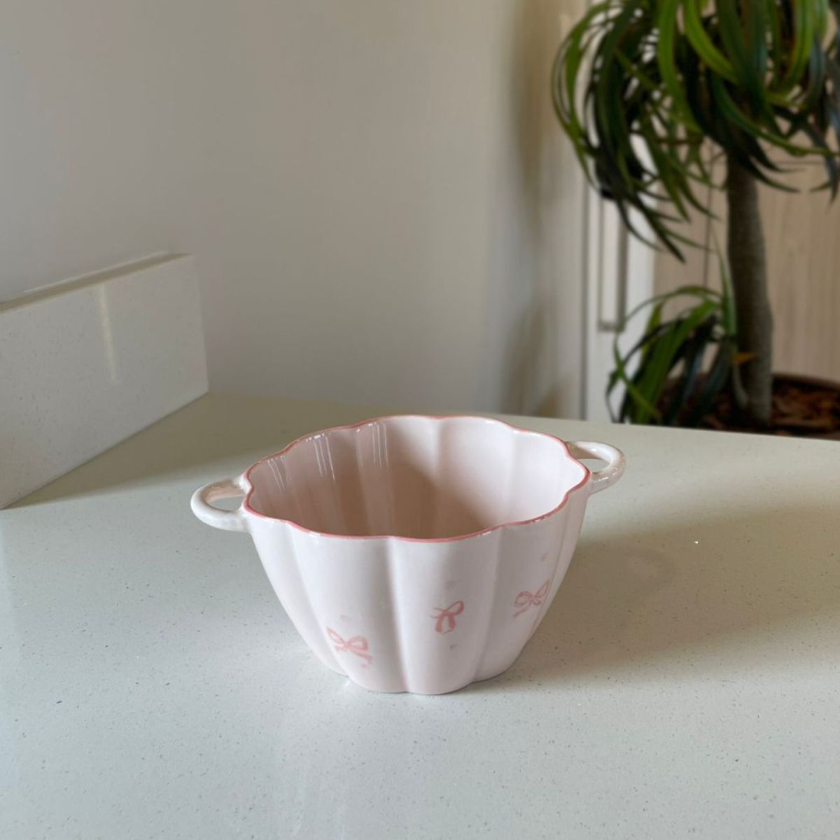 Essa charmosa tigelinha em cerâmica traz um design encantador, com formato levemente ondulado e detalhes sutis em laços, que transmitem leveza e romantismo. O acabamento em tom suave com borda delicada valoriza ainda mais a peça, tornando-a perfeita para compor mesas elegantes e acolhedoras.