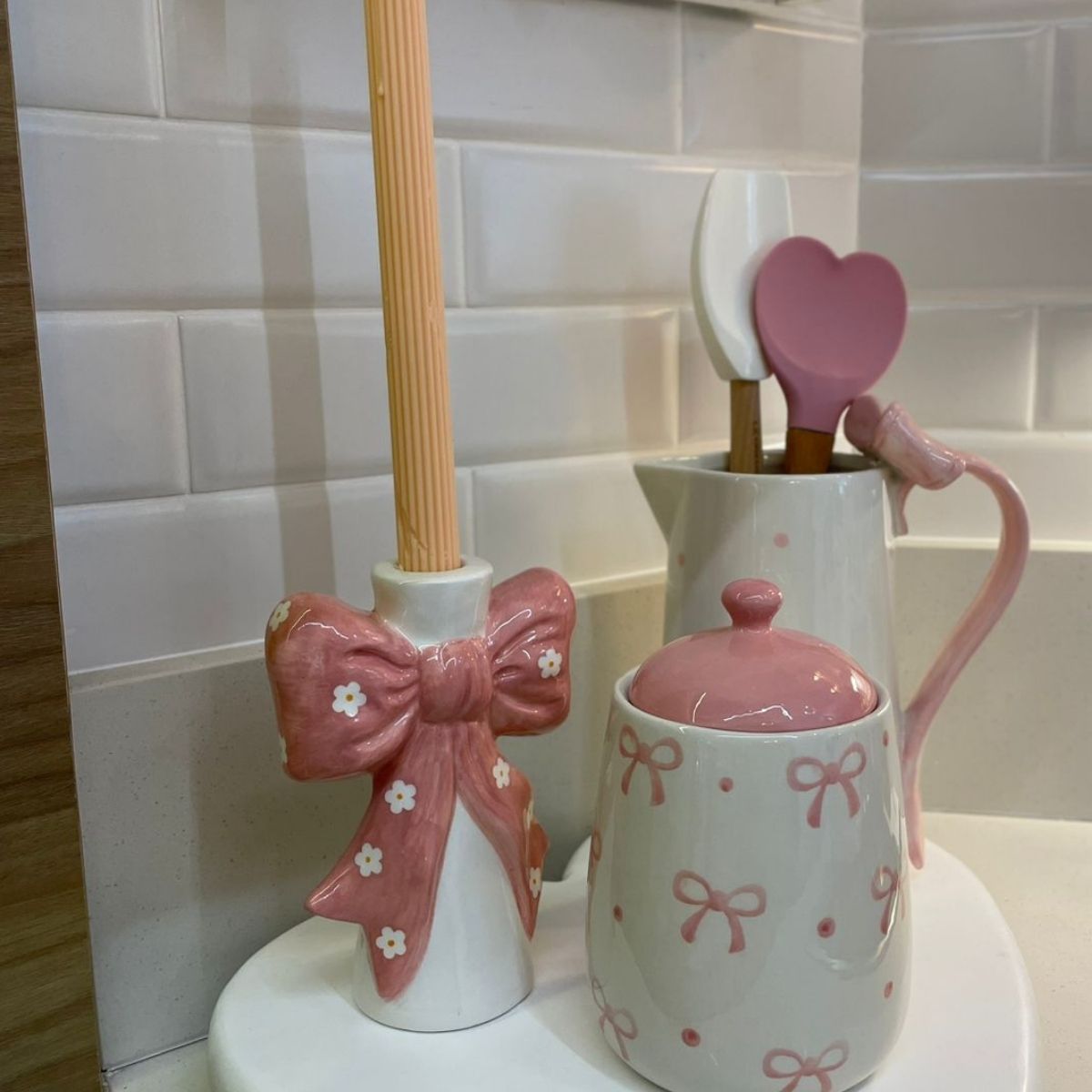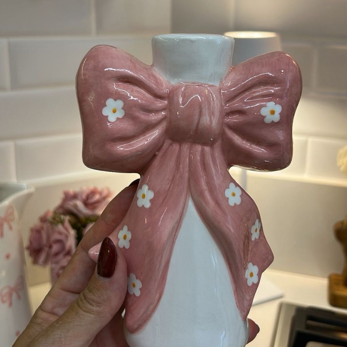 O castiçal decorativo com laço é a escolha perfeita para quem ama composições românticas e cheias de charme. Com acabamento em cerâmica esmaltada em tom rosa suave, ele traz leveza e elegância para qualquer ambiente.