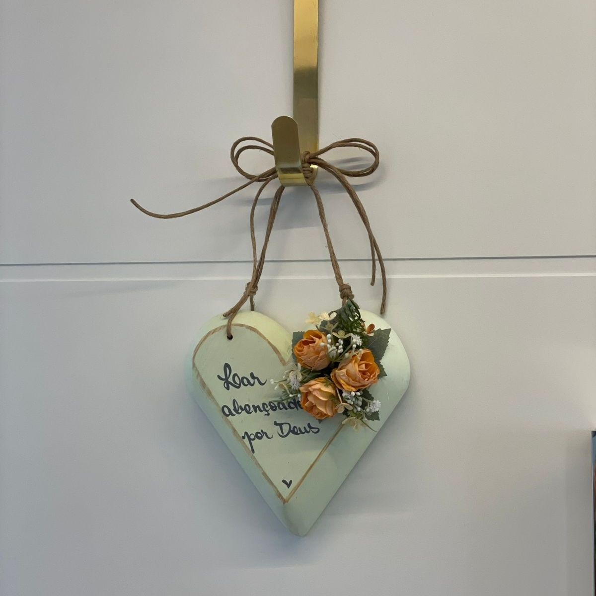 Este lindo enfeite em formato de coração traz a mensagem “Lar abençoado por Deus”, perfeito para quem valoriza um espaço acolhedor e cheio de boas energias. Com acabamento rústico, detalhe em corda para pendurar e um charmoso arranjo floral, ele é ideal para decorar portas, paredes ou aquele cantinho especial da casa.