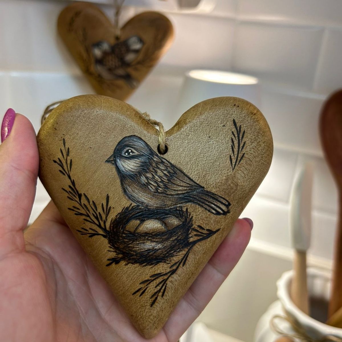 Em até 2x de R$ 68,95 sem juros À vistaR$ 131,01no PixCORAÇÃO PASSARO NINHO PIROGRAFADO 11X11CM