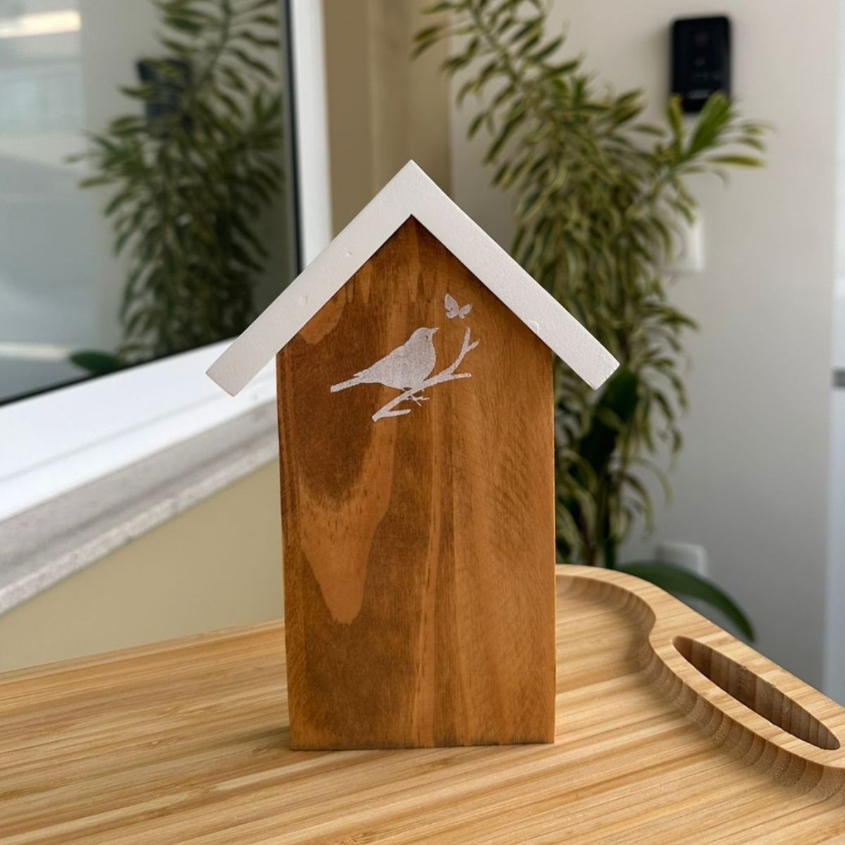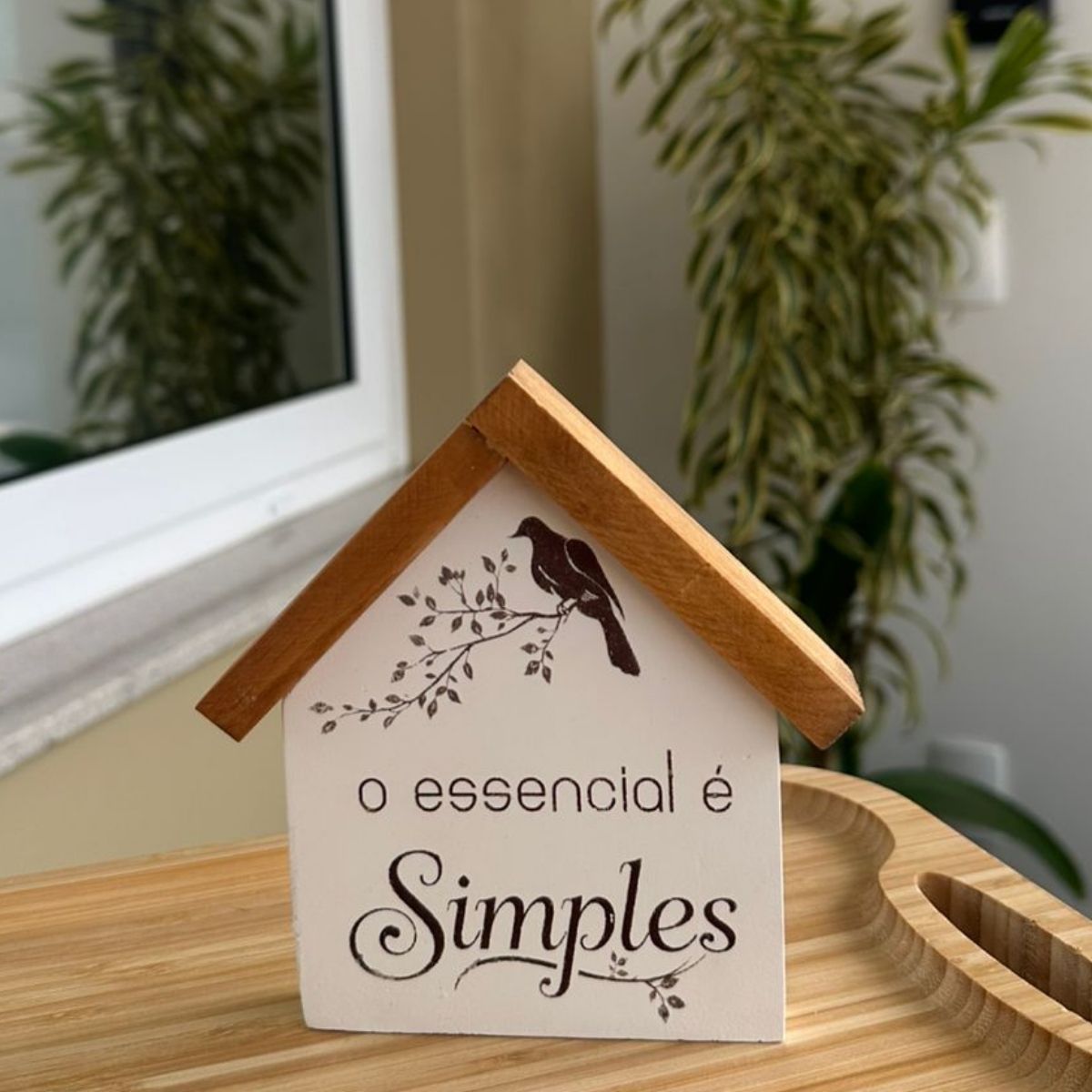 Cada casinha traz elementos suaves da natureza, como o passarinho e a mensagem “O essencial é simples”, criando uma atmosfera de acolhimento, leveza e afeto. Perfeitas para decorar aparadores, bandejas, estantes, mesas laterais ou aquele cantinho especial que pede mais significado.