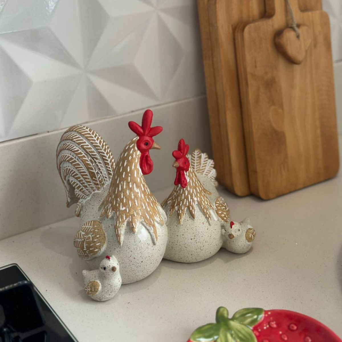 O conjunto é composto por galinha, galo e pintinhos, formando uma cena encantadora que transmite união, família e aquele clima gostoso de casa de fazenda.