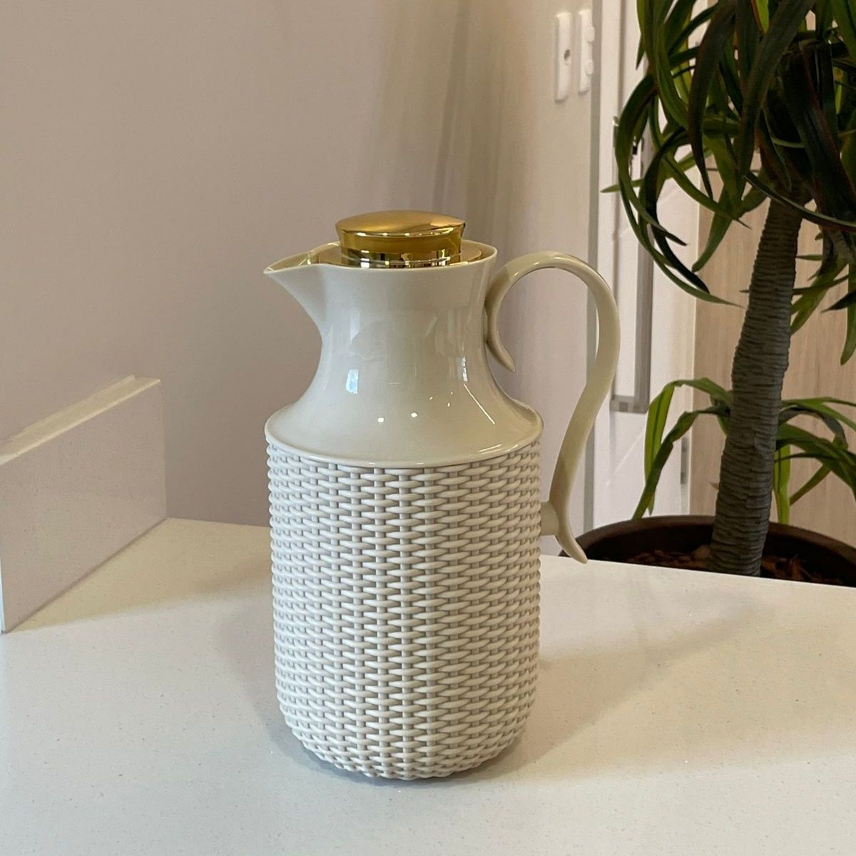 Garrafa Térmica de Plástico Bege com Tampa Dourada Vintage Rattan 1L – Wolff