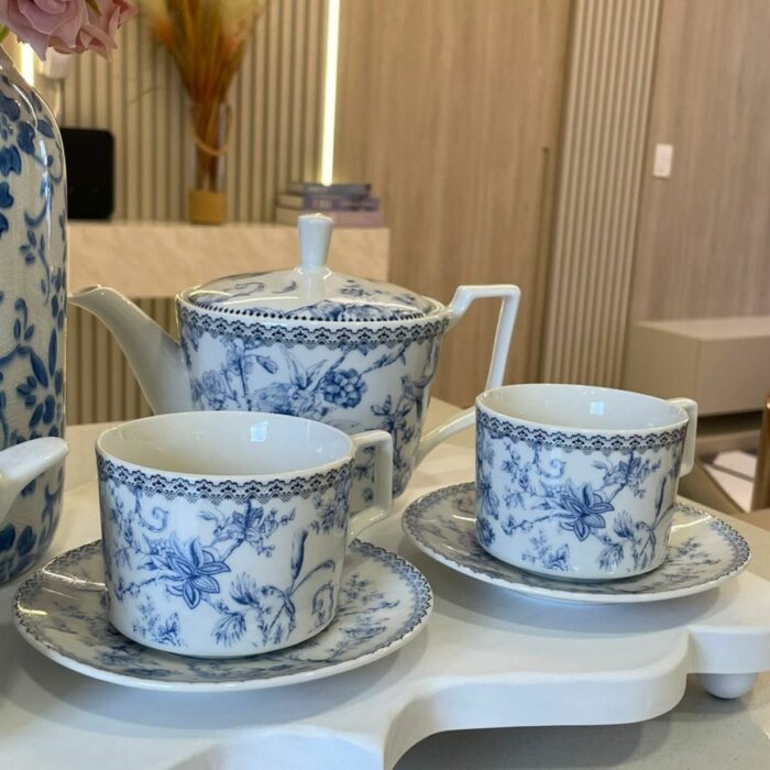Transforme o seu momento do café ou chá em uma pausa delicada e encantadora. Este jogo de xícaras em porcelana com estampa floral azul oferece mais do que funcionalidade: ele celebra o bem-estar e beleza.