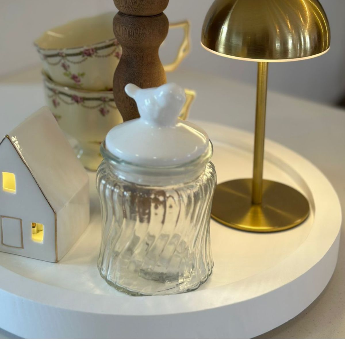 Delicado e cheio de charme, este pote de vidro com tampa em cerâmica é aquele detalhe especial que transforma a decoração com suavidade e afeto. O corpo em vidro transparente com textura elegante traz leveza, enquanto a tampa branca em cerâmica, com um delicado passarinho no topo, adiciona um toque poético e acolhedor.
