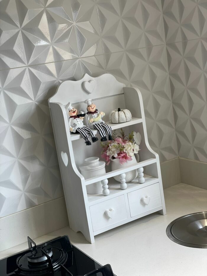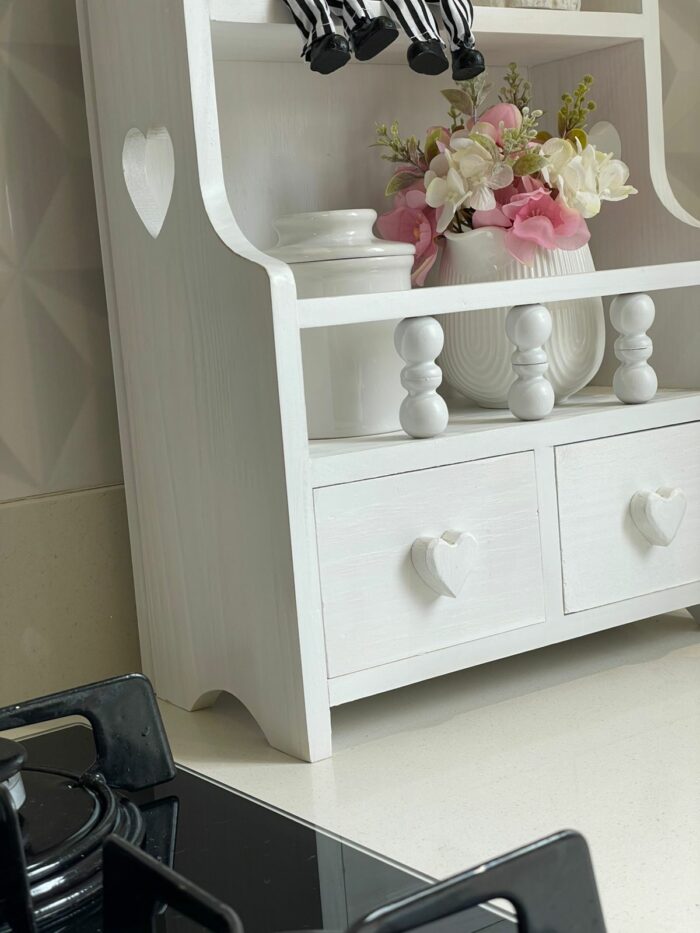Aqui está uma peça que vai adicionar o mais alto grau de beleza em seu ambiente. Com essa mini prateleira de bancada você pode organizar suas peças de decoração, seu cantinho do café, sua cozinha ou qualquer lugar que precise de um toque de delicadeza e amor. Seus detalhes com recortes e apliques de coração aumentam ainda mais seu charme, tornando-a uma peça atemporal e irresistível.