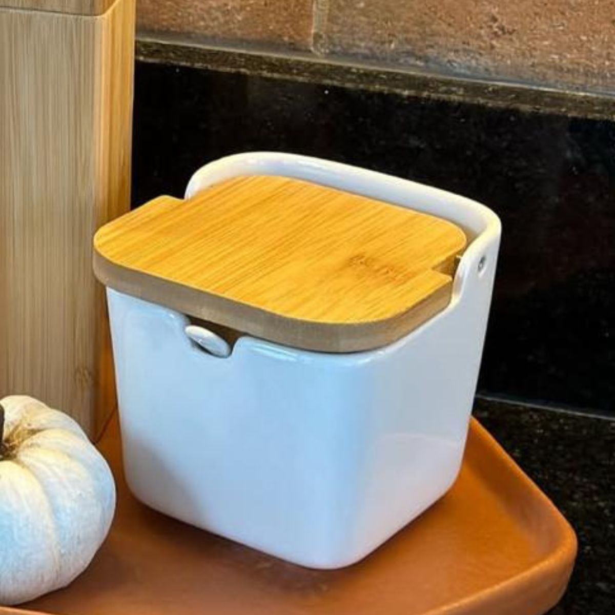Saleiro de Parede de Cerâmica com Tampa de Bambu Sweet Home 10cm x 7,5cm x 13cm -Lyor