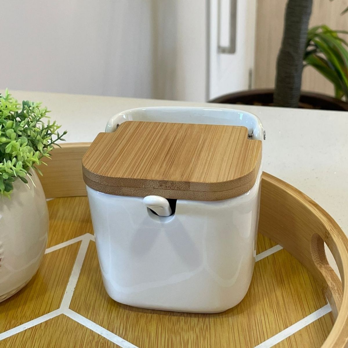 Em até 2x de R$ 59,95 sem juros À vistaR$ 113,91no PixSALEIRO DE MESA DE CERAMICA C/TAMPA DE BAMBU E COLHER BIANCO 9x9x8,5cm