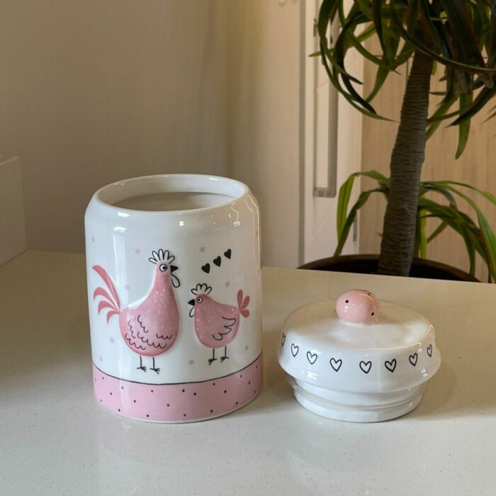 Leve para sua cozinha um toque de doçura com o Pote Hermético Galinha Rosa, uma peça que combina beleza, organização e aquele estilo campestre acolhedor que transforma qualquer cantinho em um lar com alma.