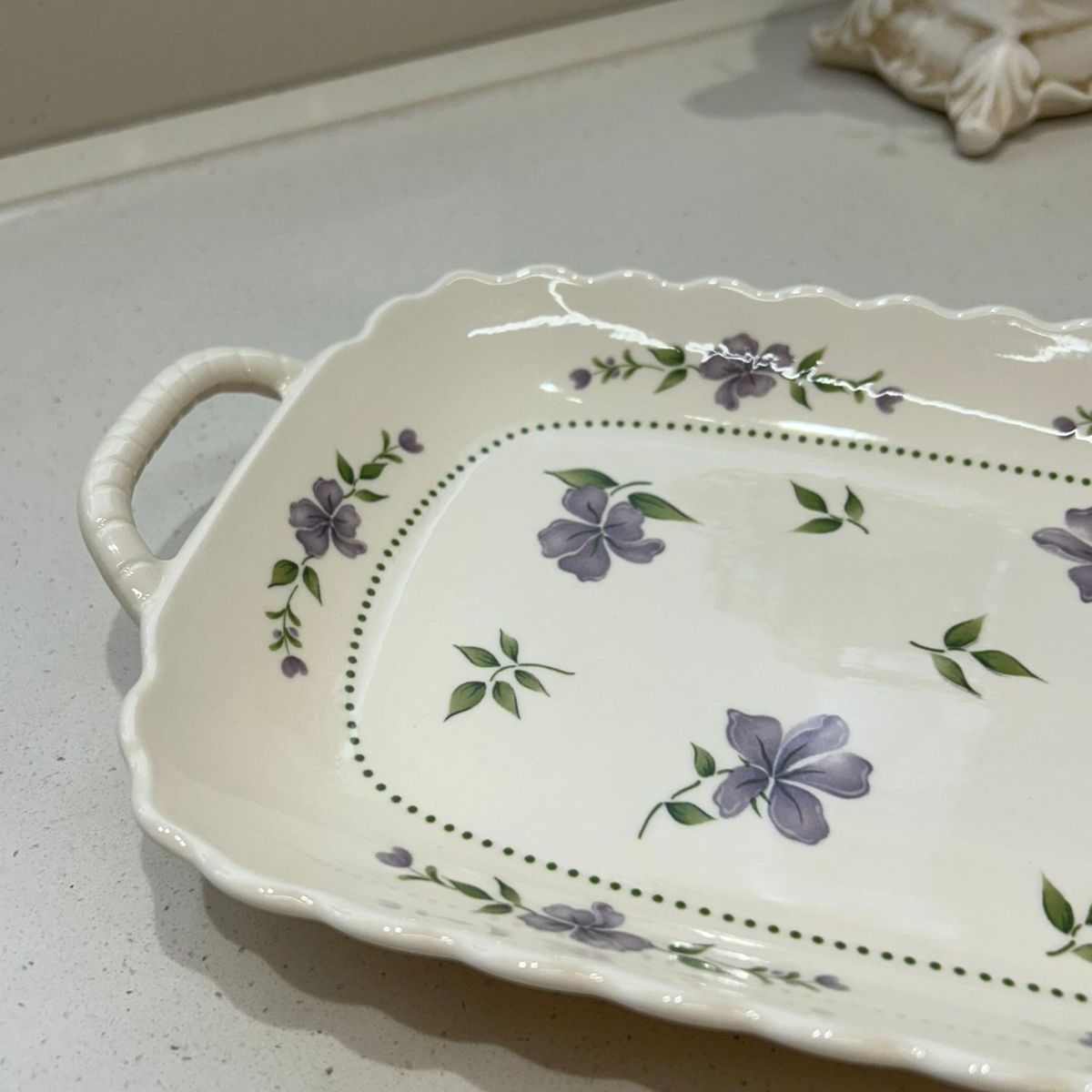 Travessa em porcelana com alças e delicada estampa floral, perfeita para servir com elegância. Ideal para levar à mesa com charme e praticidade.
